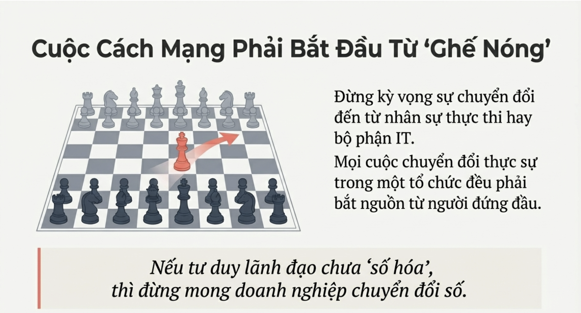 Đừng kỳ vọng sự chuyển đổi đến từ nhân sự thực thi hay bộ phận IT. Một góc nhìn thẳng thắn: Mọi sự chuyển đổi phải bắt nguồn từ chính người chủ doanh nghiệp.